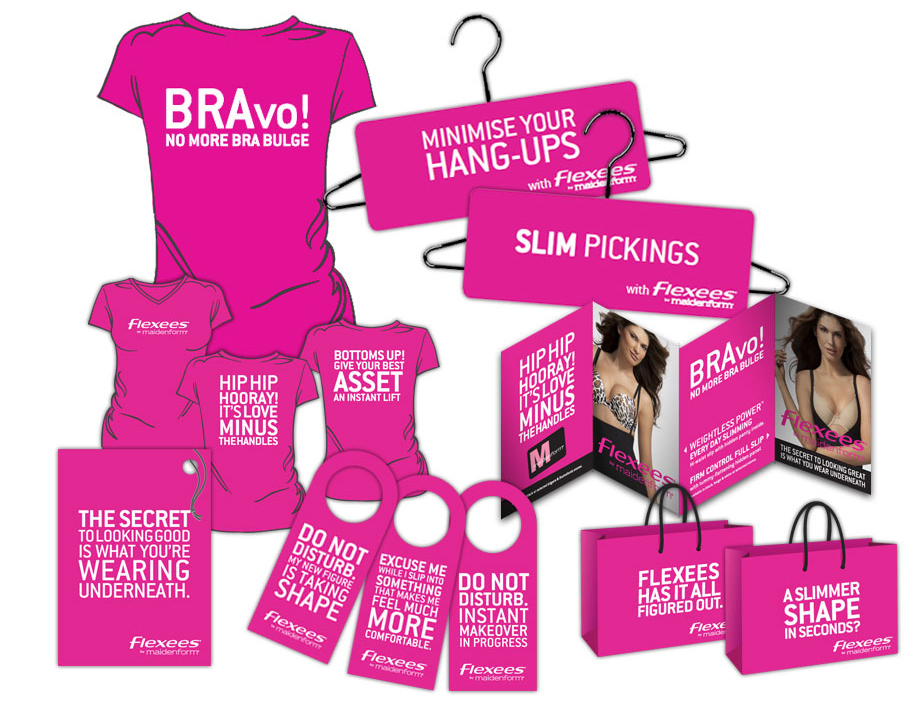 | Brief: | The Flexees range of shapewear slims unruly figures in seconds. For a new in-store campaign Flexees needed a series of irreverent copy driven teaser posters, tent cards, change room tags, staff T-shirts and retail bags. We also installed magic slimming mirrors in-store with Flexees messaging printed on them. |