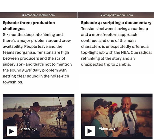 I was involved in this 18-month project from start to finish. I initially came onboard as a Series Researcher and then worked as the the sole Scriptwriter and Story Editor on all 6 episodes (each episode had a different director). At a later stage I took on additional responsibilities as a Post-Production Supervisor. You can view the official American-made trailer for the series and full episodes at www.redbull.tv